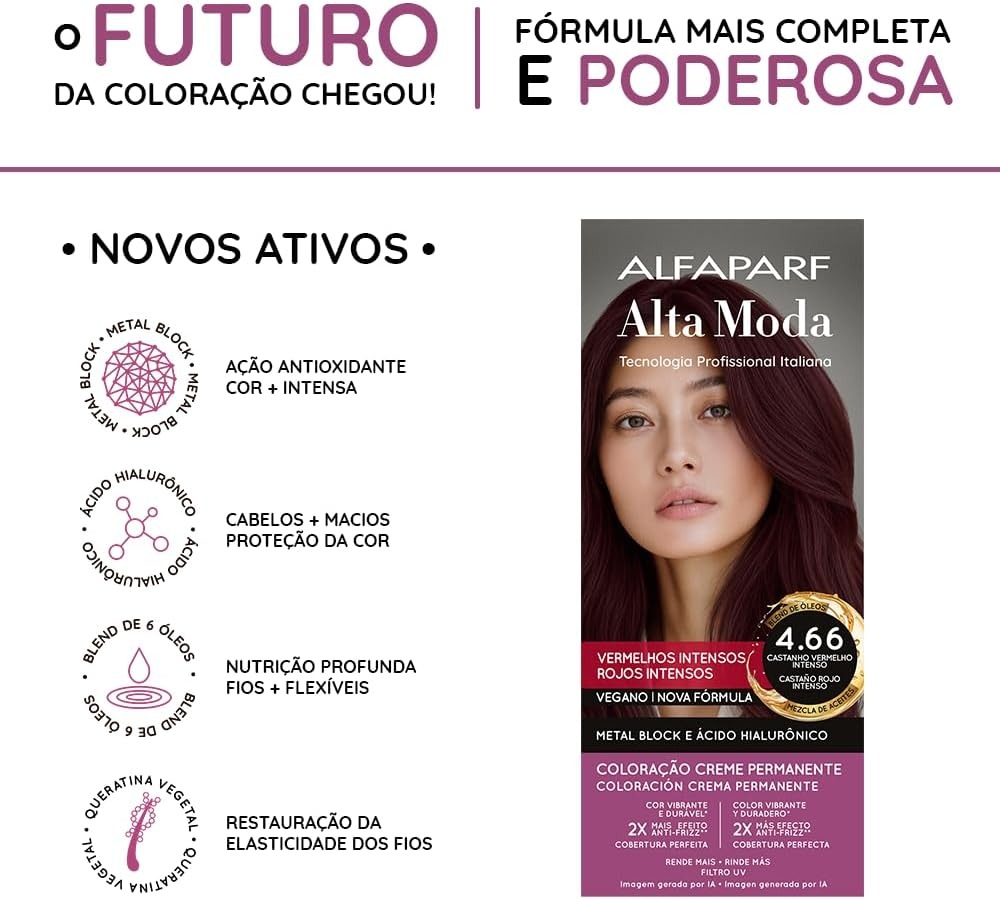 A linha Alta Moda é… Colore da Alfaparf foi desenvolvida para oferecer uma experiência de coloração profissional em casa. Sua fórmula contém pigmentos micronizados concentrados, que penetram profundamente na fibra capilar, proporcionando uma cor uniforme, vibrante e de longa duração.